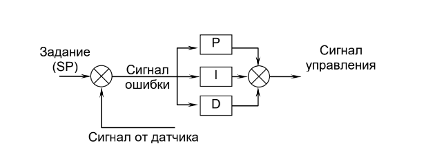 Ошибка просто умножается на одно, два или все рассчитанные действия P, I и D (в зависимости от того, какие из них включены). Затем полученные значения «ошибка x управляющие действия» суммируются и отправляются на выход контроллера.